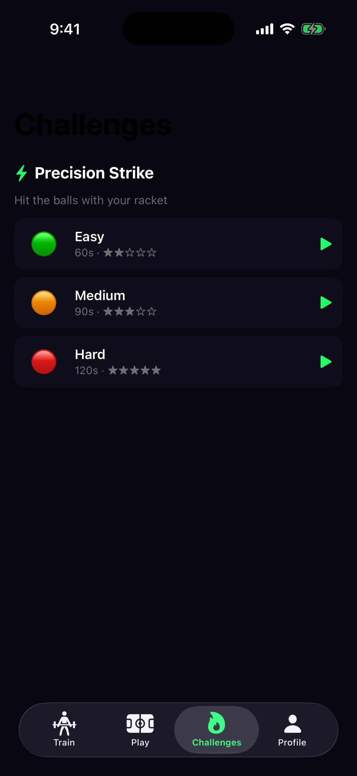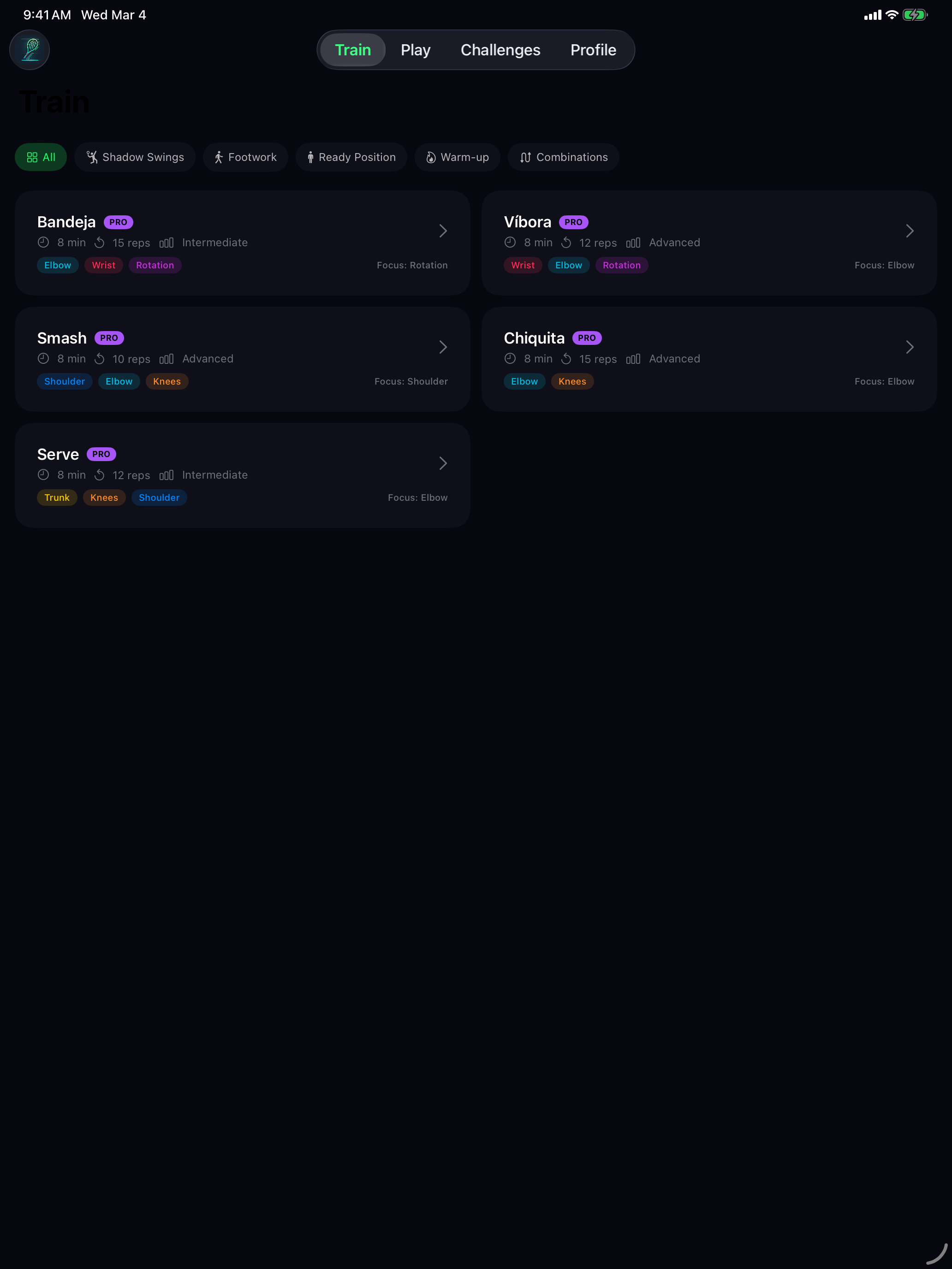 Guided challenge drills. The screen tells you what shot to hit, you execute it, and the AI scores you in real time.